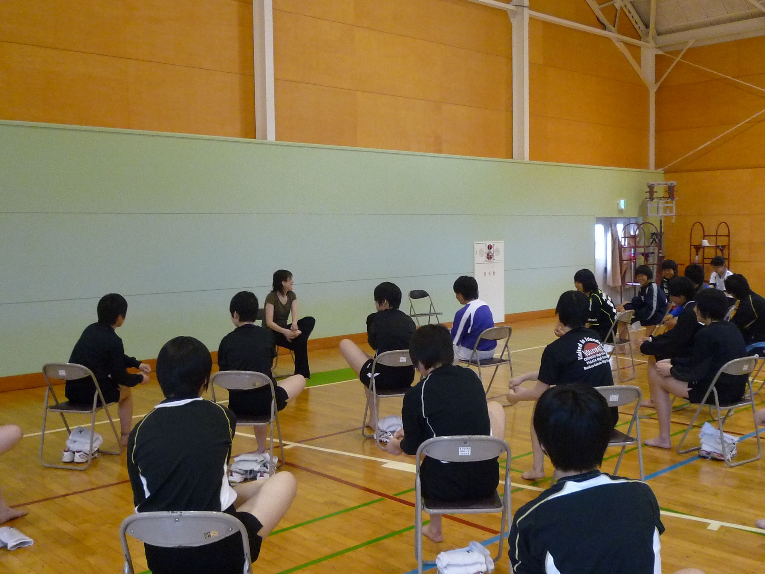 今回ご参加いただいたのはサッカー部とバレーボール部の選手の皆さま約30名。体育館の半分を使用して、学校ではおなじみパイプイスを並べてスタートです。