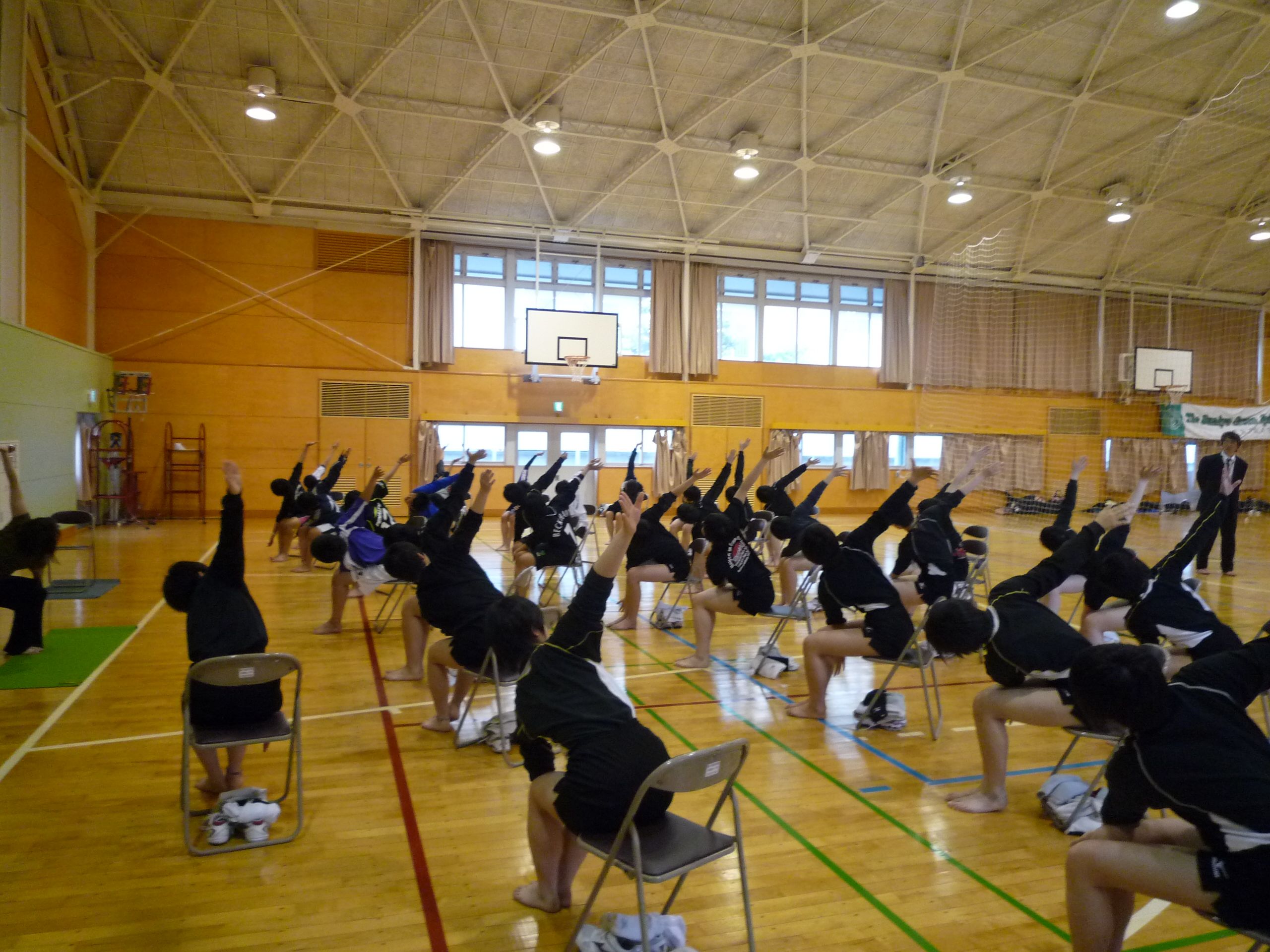 いろんな動きを吸収したい!という選手たちの熱意によって、イスの上・フロア、そして実際の競技に近いスタンディングの状態でのからだづかいとフルコースでのジャイロキネシスでした。